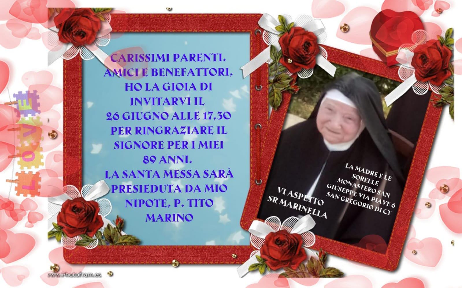 Carissimi parenti, amici e benefattori. Ho la gioia di invitarvi il 26 giugno alle 17:30 per ringraziare il Signore per i miei 89 anni. La Santa Messa sarà presieduta da mio nipote, il Sacerdote Tito Marino.